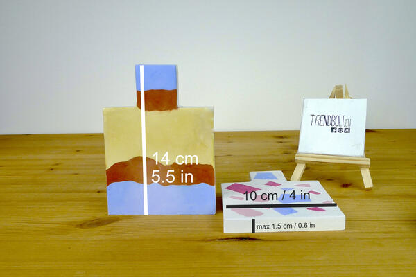 ± dimensions are shown on the photo, depth can be adjusted (thinner) when filling the mold, max is 1.5 cm.
