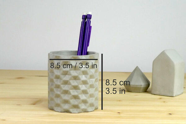 With this mould you can make concrete pencil holders/planters/cups with the following dimensions: