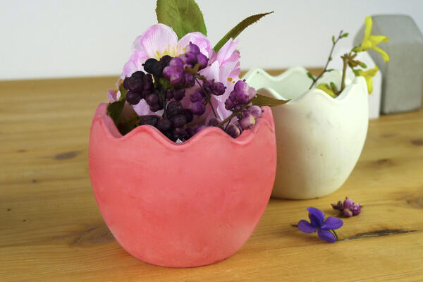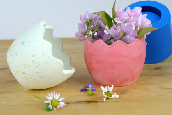 Silicone mold for multiple use to cast small planter with rounded bottom in shape of Easter egg.