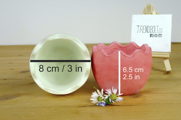 This reusable silicone mould is intended to cast small flower pots, candle containers, Easter decor egg with ± dimensions shown on the photo.
