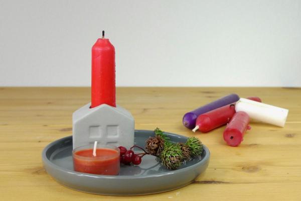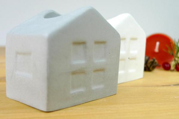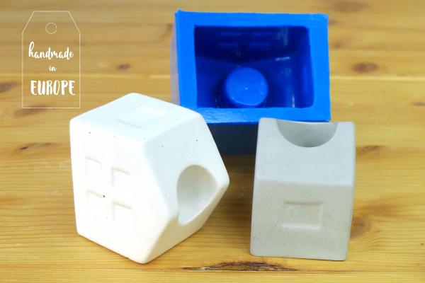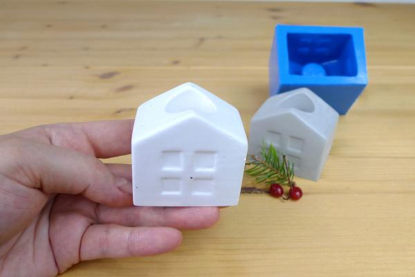 Silicone mould to cast concrete candlestick holders in the shape of house.