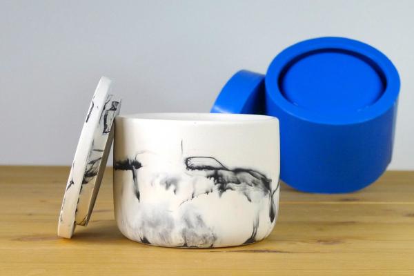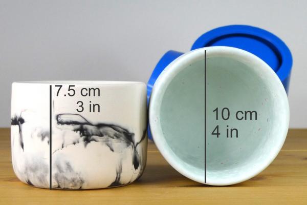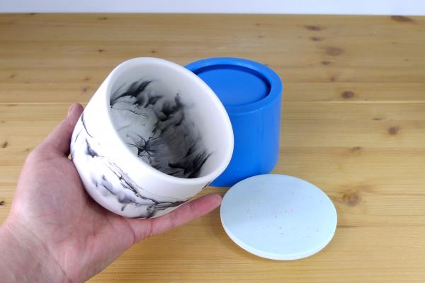 This reusable silicone mould is intended to cast medium pot with lid shown on the photo, that can also be used for pouring modern, minimal candles.