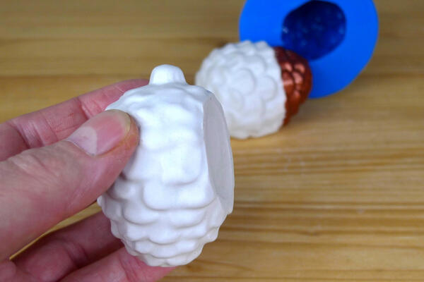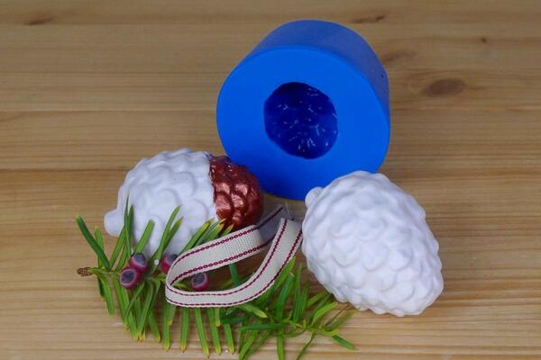 Silicone mold for multiple use: one-piece seamless mold to cast Christmas pine cone.