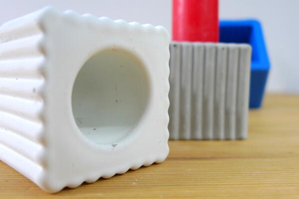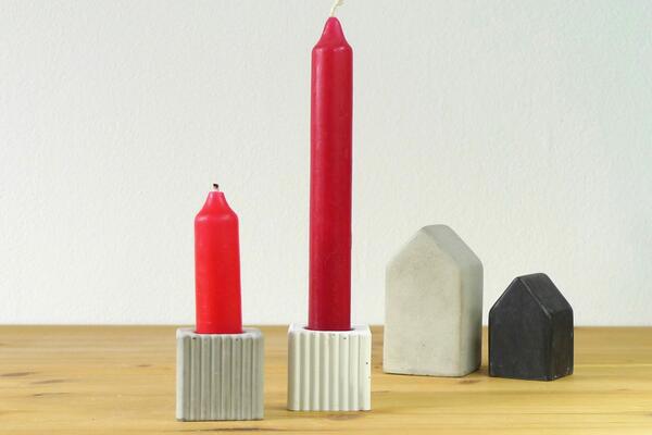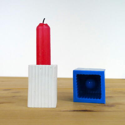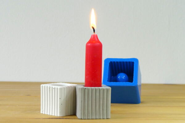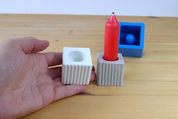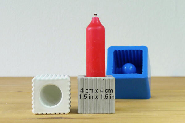 Silicone mould to cast concrete cube candle holders with stripy pattern for stick candles.