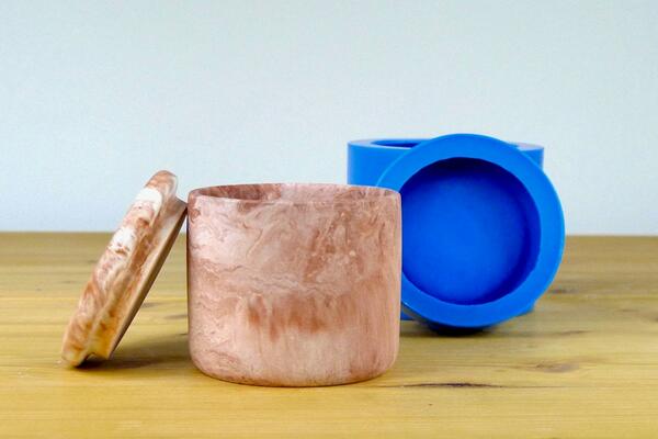 Silicone mold for multiple use: one-piece seamless mould to cast medium round planter with thinner walls + lid.