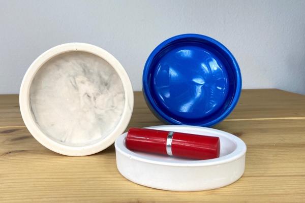 Silicone mold for multiple use: one-piece seamless mold to cast small round tray/plate.