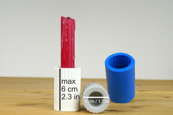 Fits both tapered and plain candlesticks. Height can be adjusted (max 6 cm/2.3 in) when filling the mold.